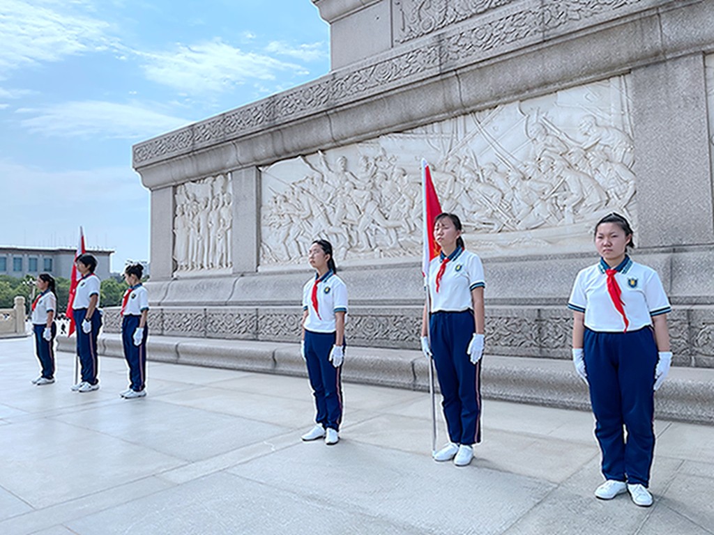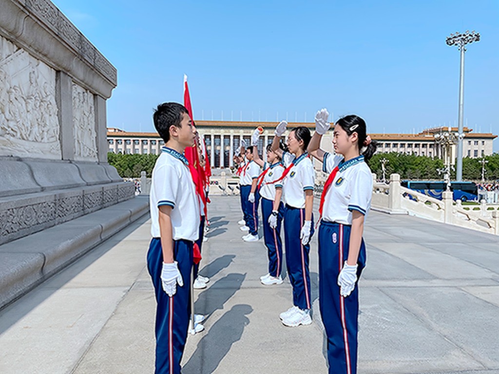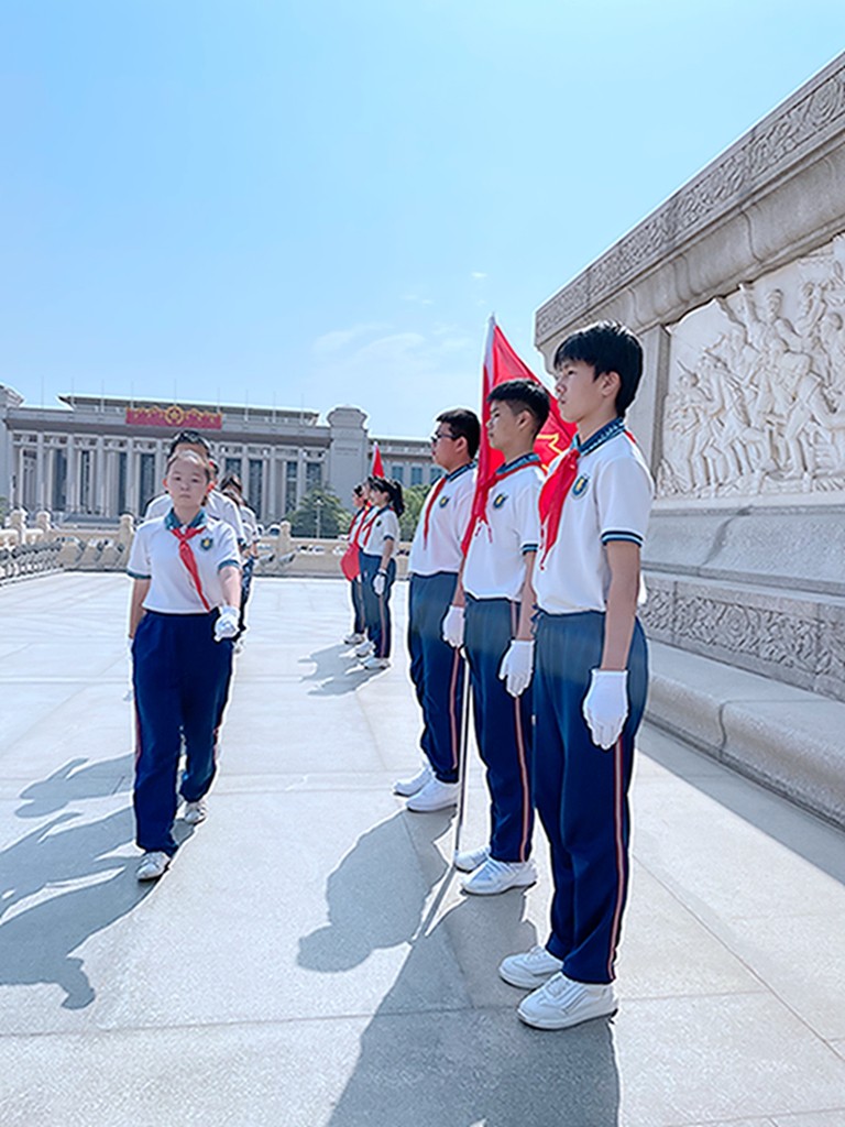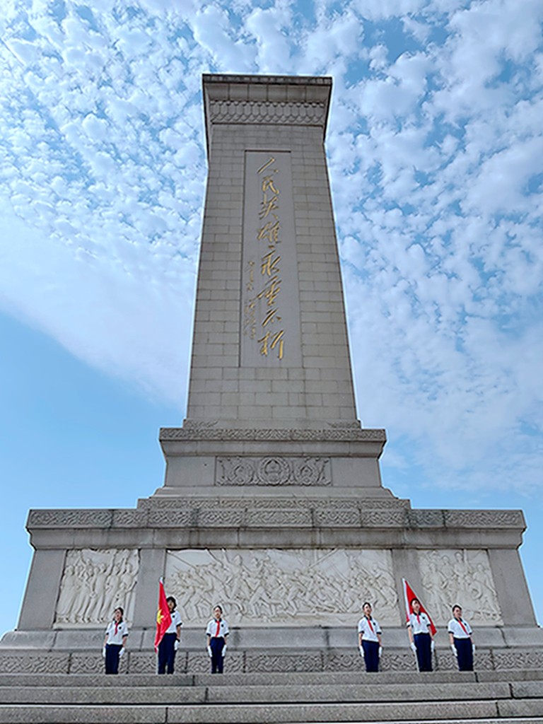 5月12日清晨,迎着明媚的阳光,少先队员们集体乘车从学校出发。当车辆缓缓驶入天安门广场,当大家站在天安门广场抬头仰望人民英雄纪念碑的一刻,激动和自豪油然而生。人民英雄纪念碑宏伟庄严,四周的浮雕栩栩如生,为我们再现了革命先烈为了人民解放和民族复兴奋勇向前的伟大历史瞬间。