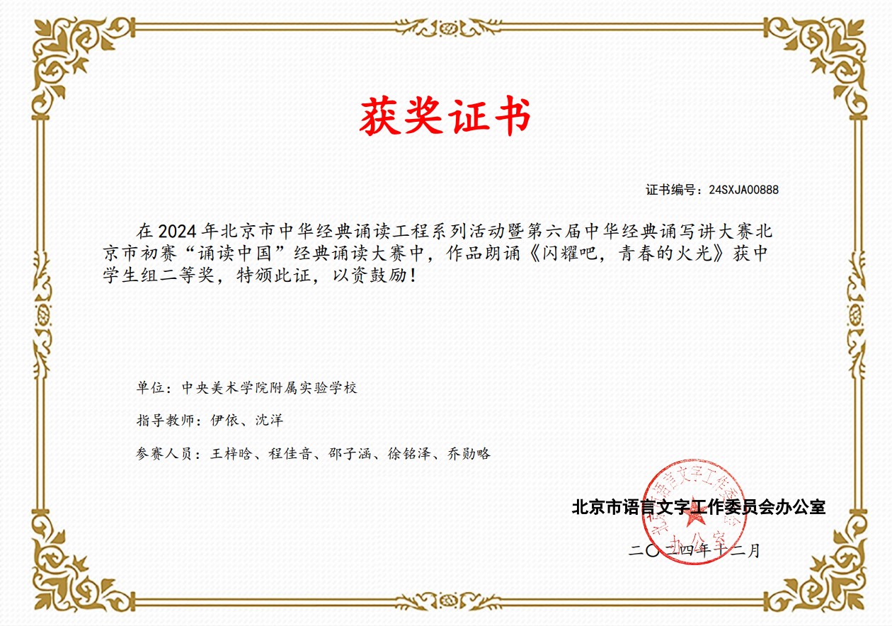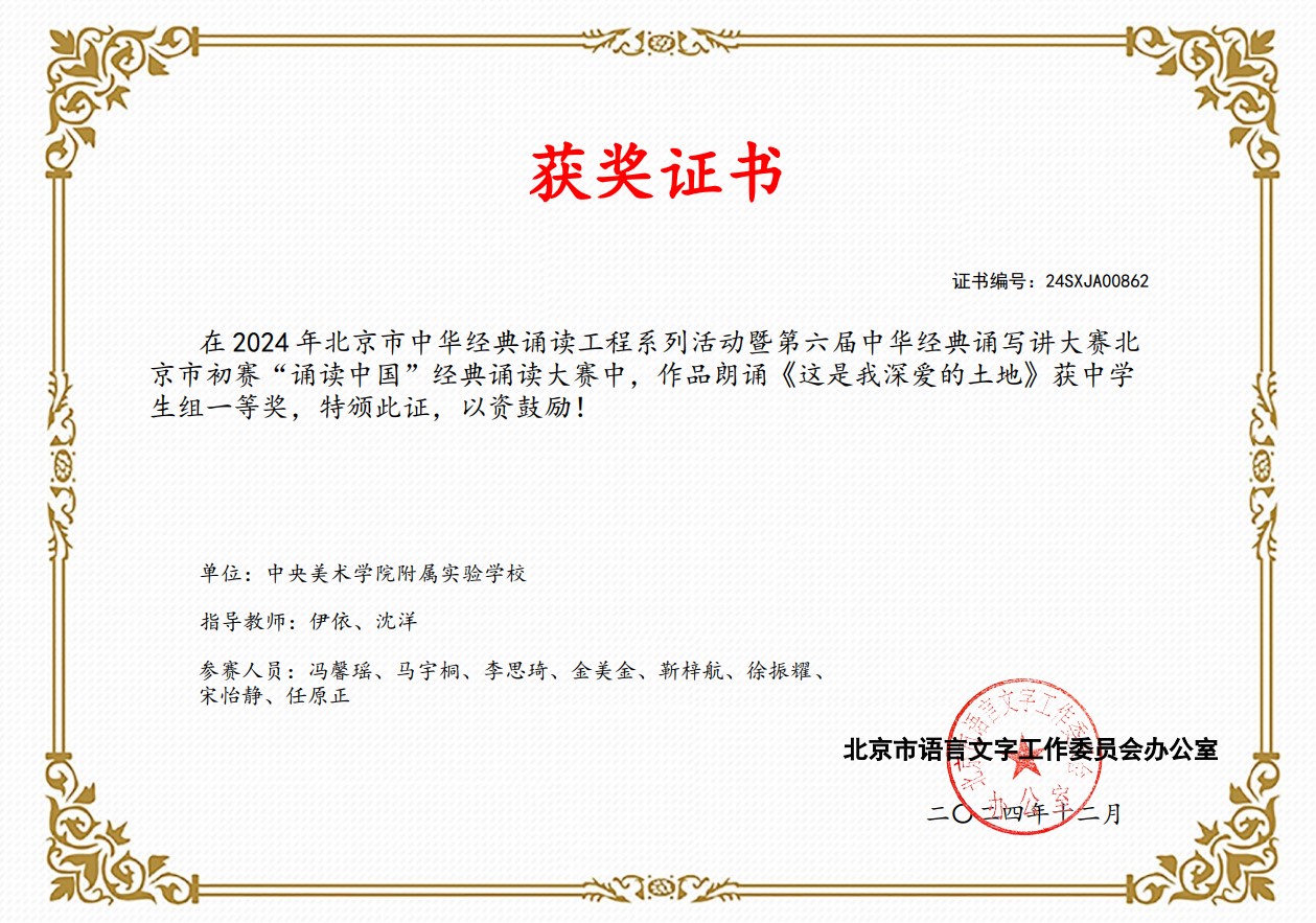 2025-01-13 03:01:00 近日,北京市教育委员会、北京市语言文字工作委员会办公室公布了2024 年北京市中华经典诵读工程系列活动暨第六届中华经典诵写讲大赛北京市初赛获奖名单,央美实验学校初中部学生2个集体朗诵作品分别获经典诵读一等奖和二等奖,伊依、沈洋两位老师获指导教师奖。这份荣誉的背后,是学校师生数月的辛勤付出与不懈努力。