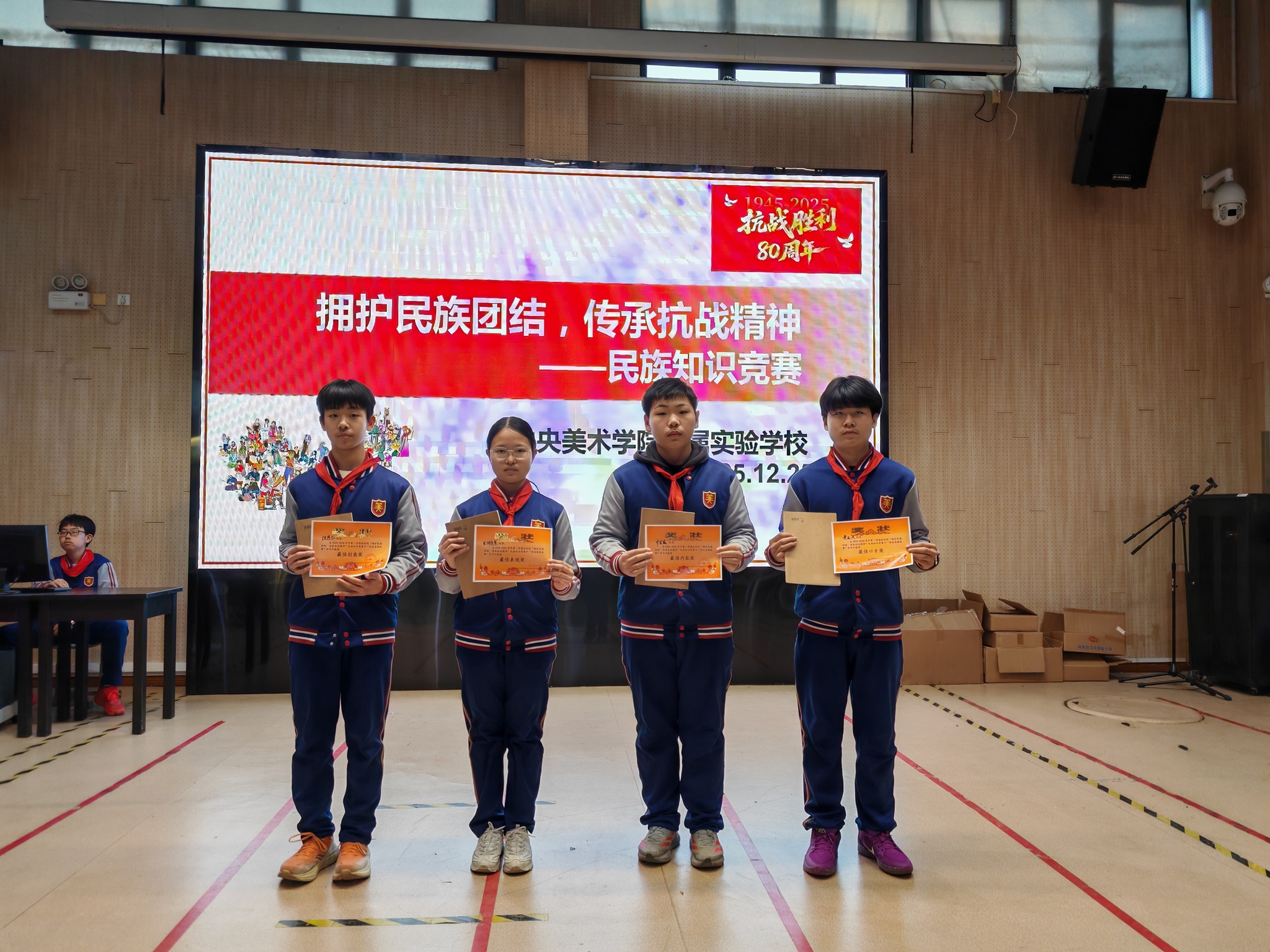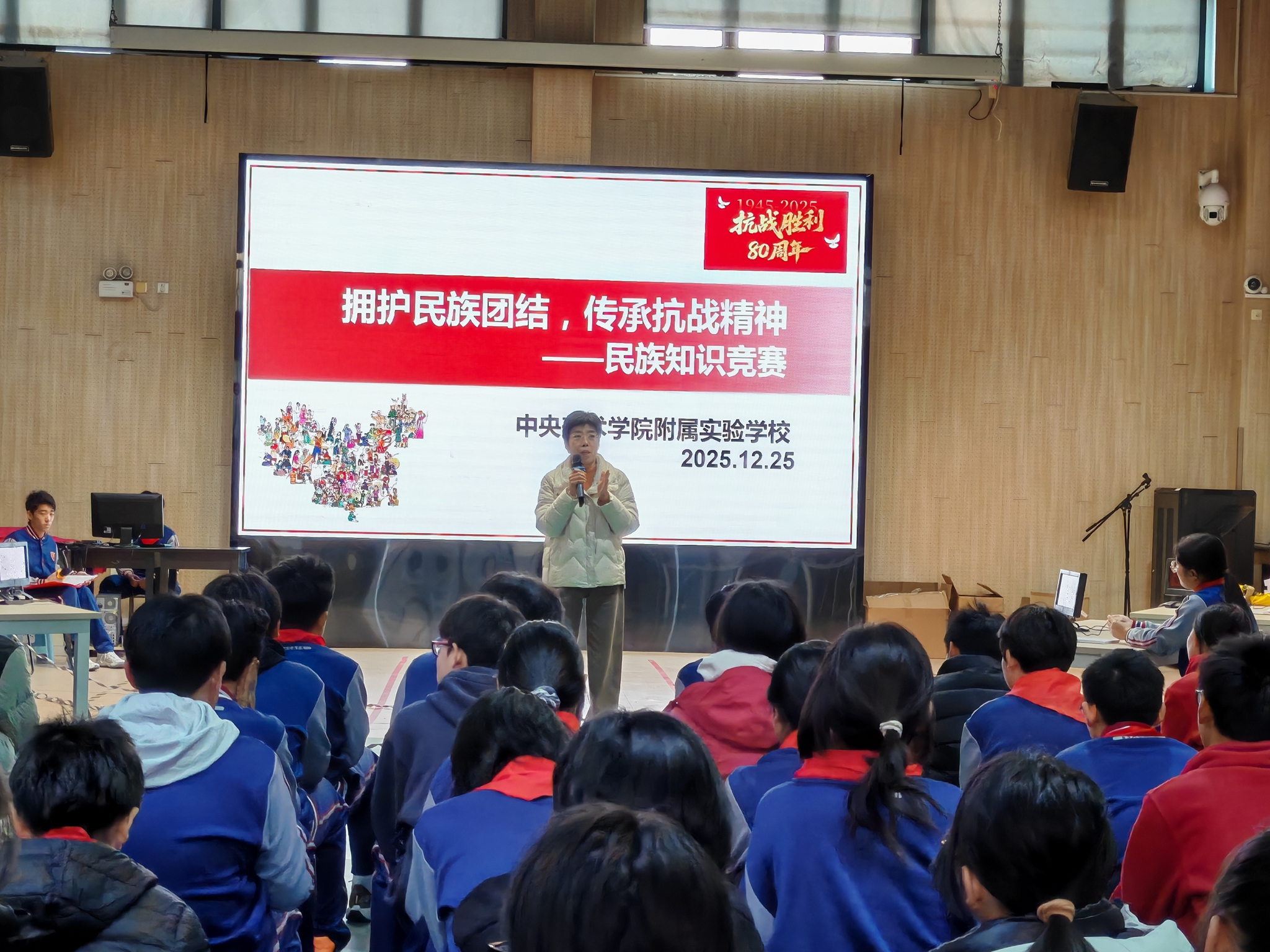 2025-12-29 08:12:00 值此抗战胜利八十周年之际,12月25日,中央美术学院附属实验学校初中部文综组携手初二年级组,成功举办“拥护民族团结 传承抗战精神”民族知识竞赛,初二年级全体学子同台竞技,在以赛促学中厚植民族情怀、传承红色基因。