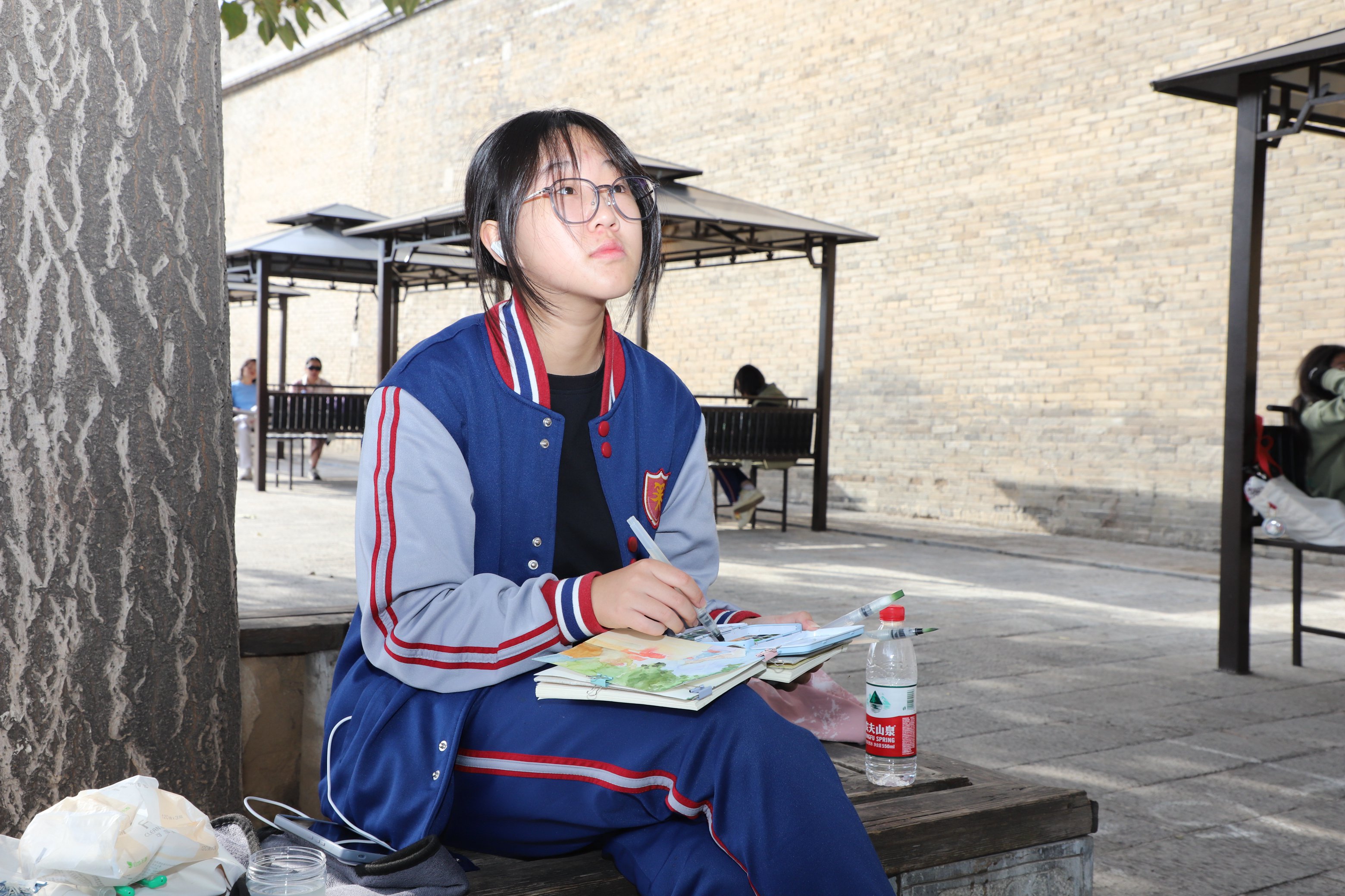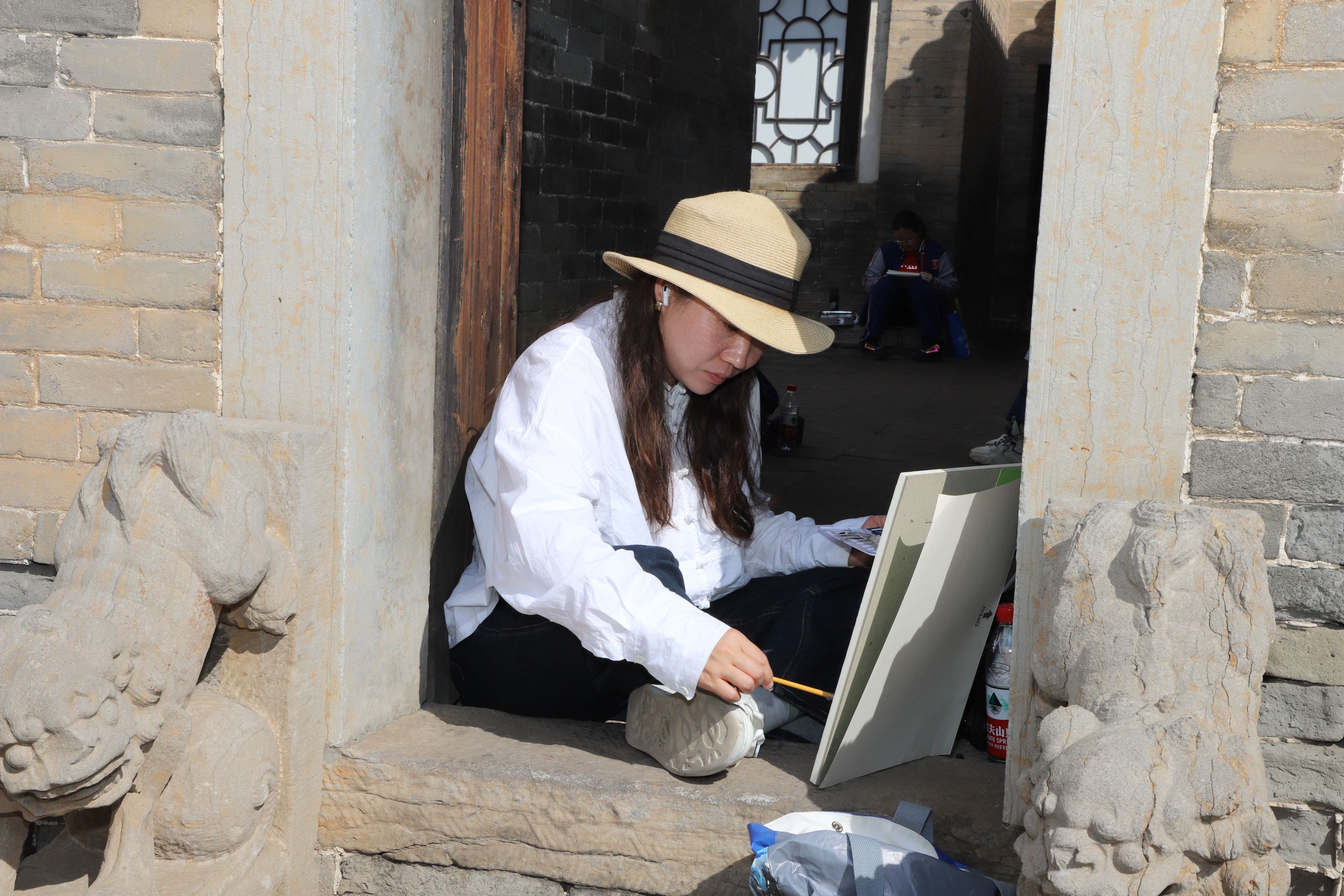 下午的时间是将所见所景记录于画本中,美丽的自然风光与辽阔的王家大院互相衬托,让我们感受到了大院的壮观奇丽;大家沉浸于绘画世界、忘我地描绘着,每位同学的画面都各有一番属于自己的独特韵味,同时也迎来了许多观众的啧啧称赞。色彩如画,跳跃在画布上,创造出千变万化的美妙景致。房、树、人汇聚于此——古宅层楼叠榭,石瓦数之不尽,一木一砖独具匠心,仿佛展现了一副风尘仆仆的历史画卷;树上微微泛黄的叶片在风中摇曳,仿佛在诉说着此地旧时的故事,每当阳光洒落,它便在叶片间熠熠生辉;房下人来人往,好似回溯到曾经院内的熙来攘往,我们享受于这片惬意,也急于用画笔为媒,留下这美好的景色和记忆。