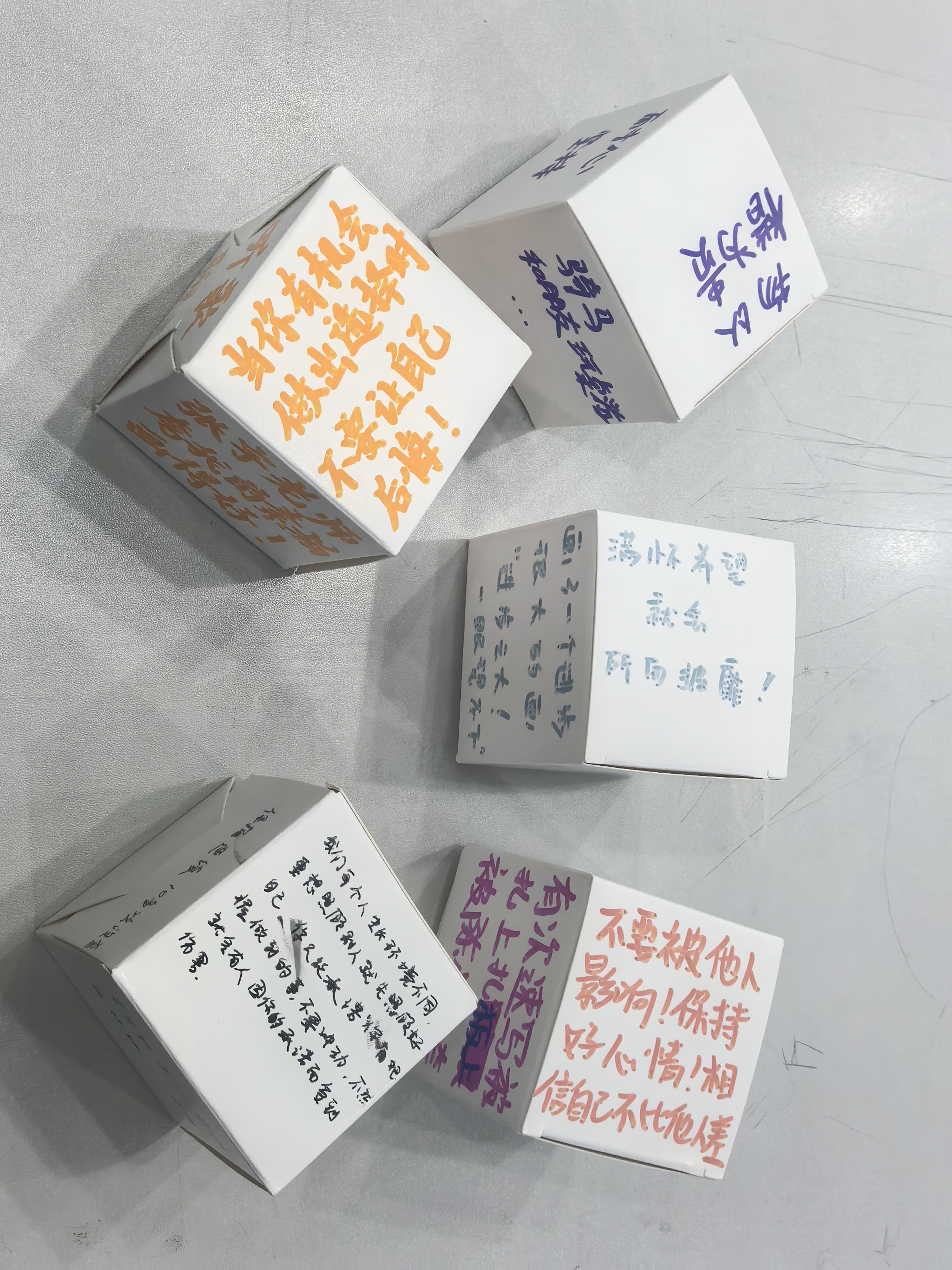 引导学生思考:“在接下来的日子里,我想像守护符一样带在身上的那句话是什么?”建议同学们书写:可以是一句励志名言、一句歌词,或自己创造的句子(如:“笔下有色彩,笔下也有未来”)。此步骤帮助考生进行自我暗示与激励,在最需要的时候,打开盒子就能获得即时的心理能量。