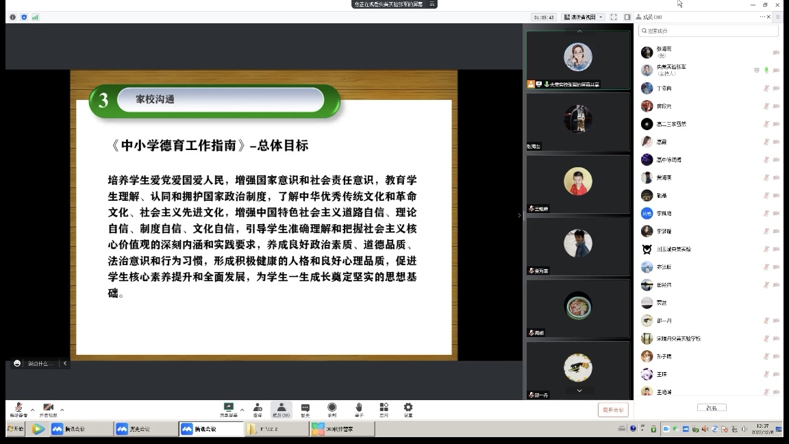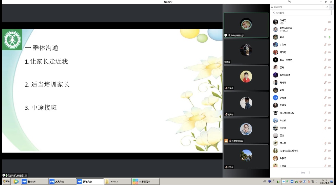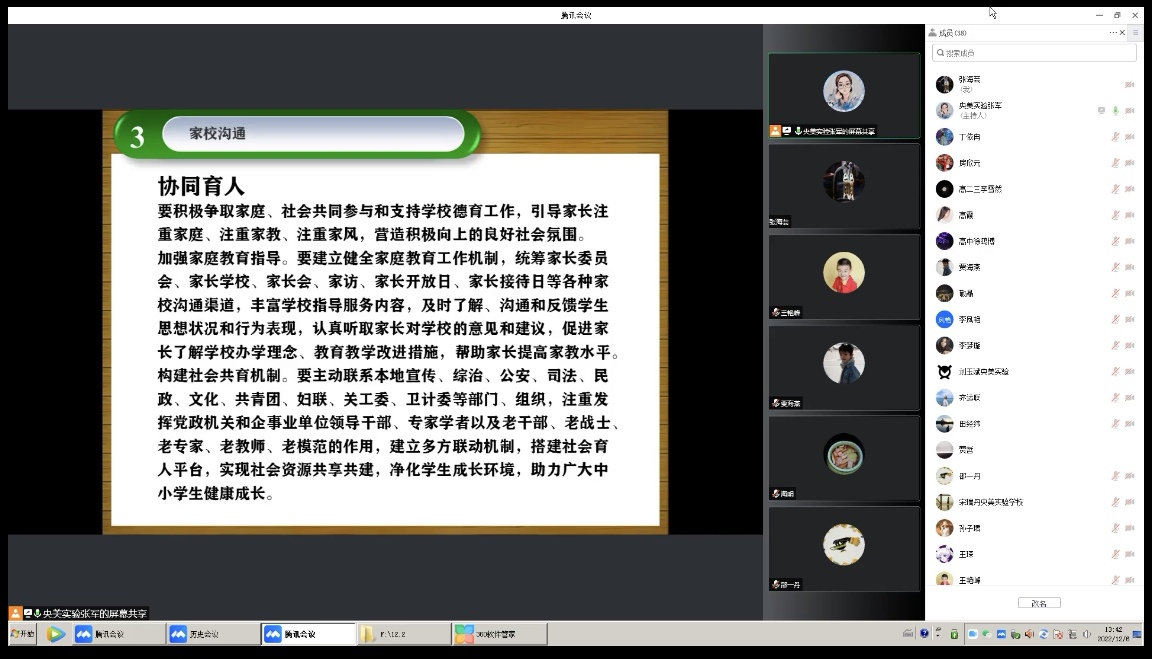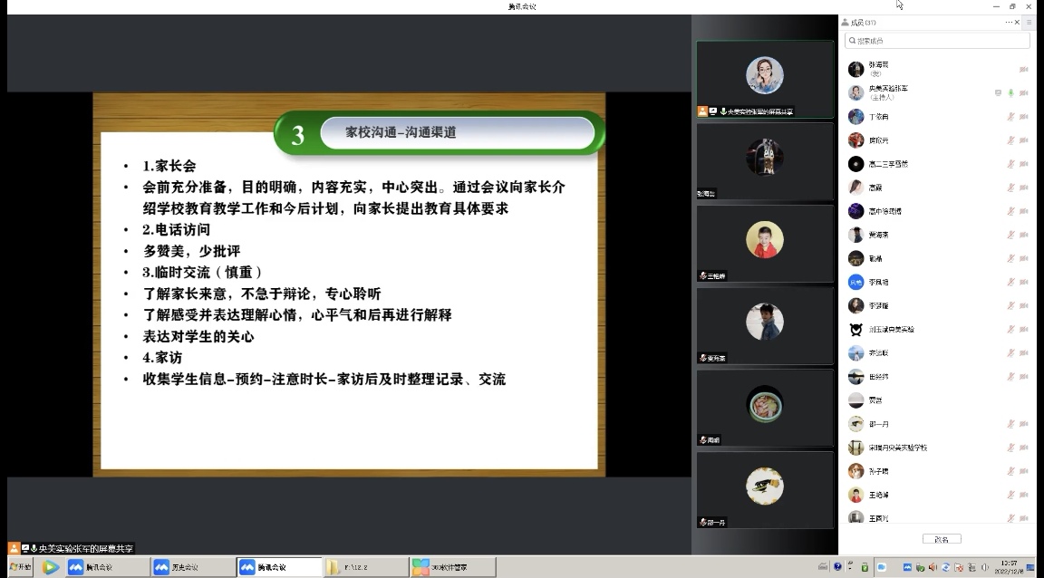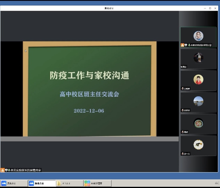 12月6日,以“防疫工作与家校沟通”为主题的班主任交流活动再次以腾讯会议方式如期召开,李剑锋书记、易瑾副校长、张海芸主任参加了本次交流活动。会上,张军主任首先将本周重点工作进行了布置,随后结合目前的防疫形势、要求对班主任老师开展系统培训,并以《中小学德育工作指南》为指引,就家校沟通内容进行重点交流。会议第二阶段,分别请张建维、高海明、吕朝晖、宋瑞丹四位老师围绕“如何做好家校沟通,如何争取家长的理解与支持形成教育合力”进行分享,四位老师分别从理论层面、到实践层面,再到案例分享与老师们展开真诚且深入的交流,郝悦斌、丁依冉、贾哲、潘九鸣老师主动结合自己的工作感受与和体会进行简短发言。会议第三阶段,易瑾副校长对班主任老师的工作进行肯定并对线上班级管理提出了具体要求和期望。最后,李剑锋书记就老师们的发言进行点评:德育处结合《中小学德育工作指南》将培养目标、协同育人提炼出来,并进行解读;所有的发言内容深刻、宽泛、深入,充分体现了教师日常管理中的用心、用情。希望能够通过这种交流,对所有的班主任老师都能有所帮助,真正的解决学校实际问题和难题。