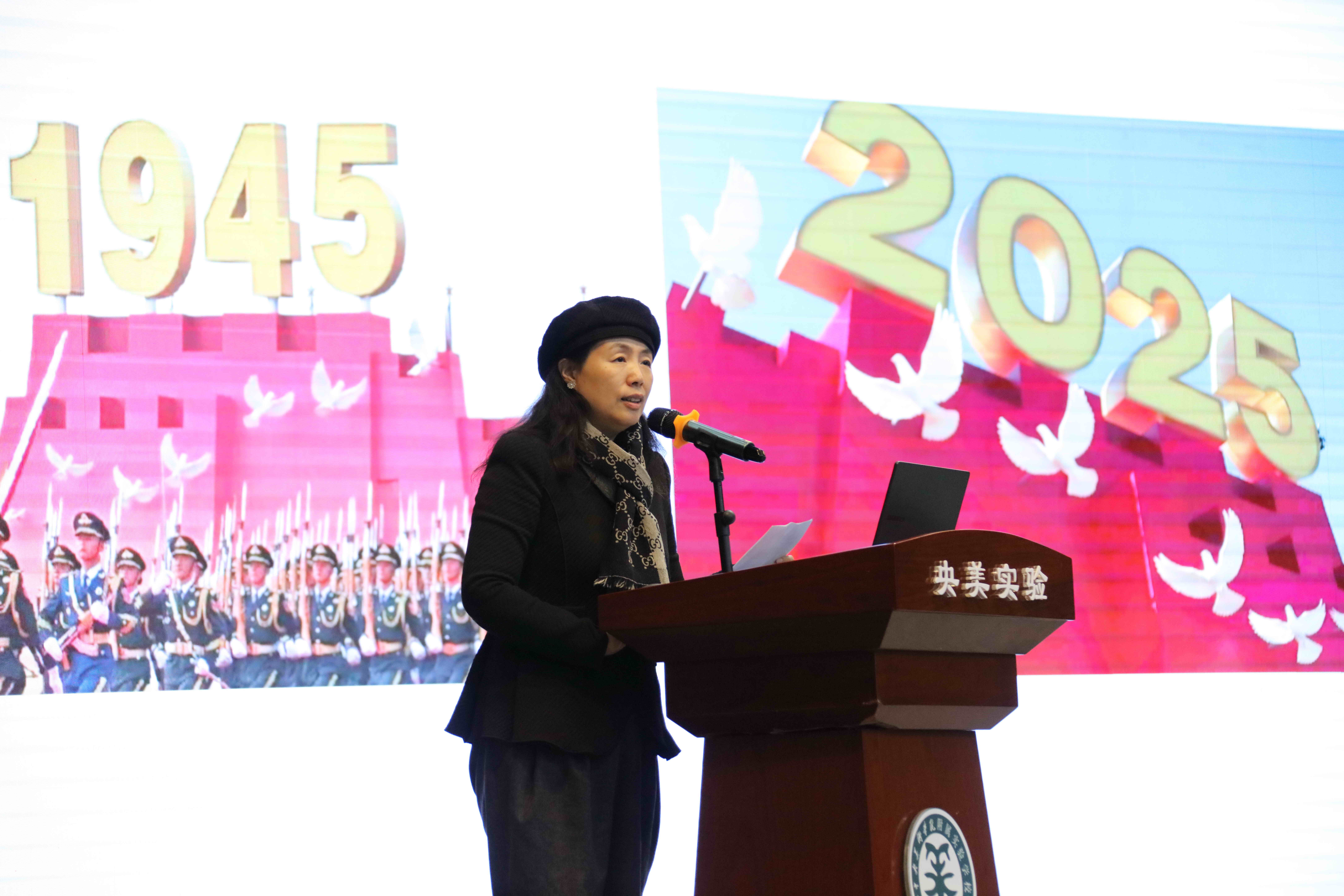马克思学院美育研究院直属党支部书记岳洁琼作为纪念大会会场设计主创总协调,讲述了团队配合协作、攻坚克难的历程。她谈到自接到任务起,学校迅速组建涵盖十余院系、120余名师生的核心团队,与北京市8家顶尖设计单位数轮比选,“众志成城”方案最终脱颖而出。为将蓝图落地,团队昼夜奋战,反复推翻重建细化设计稿。从“钢铁长城”年号台的细节打磨,到“曙光红”渐变色工艺攻关,再到5万座椅“人”字形阵列的精准测算,以多学科协作与坚韧毅力攻克难关,用使命必达的信念完成国家任务,诠释央美人的责任担当。