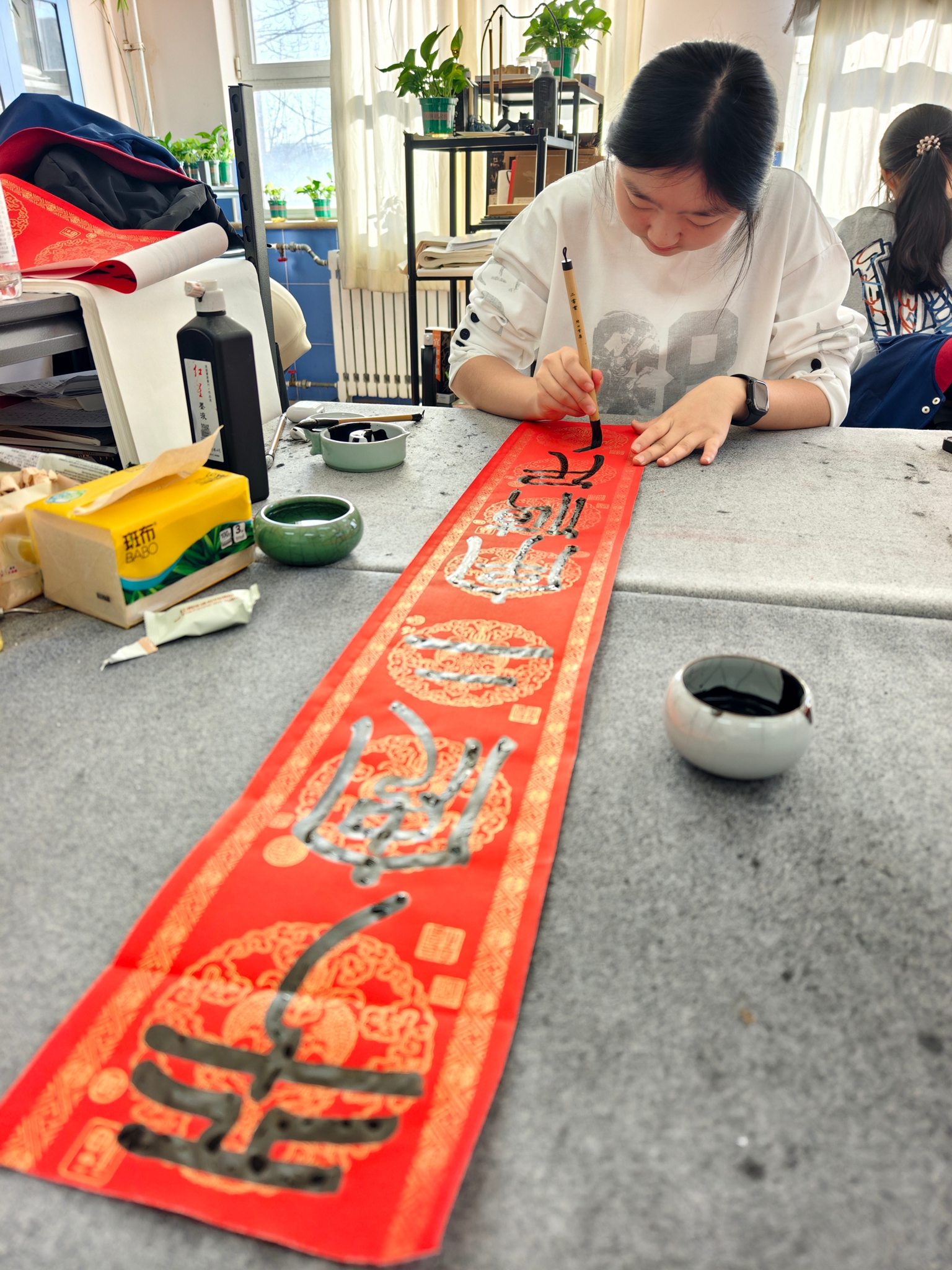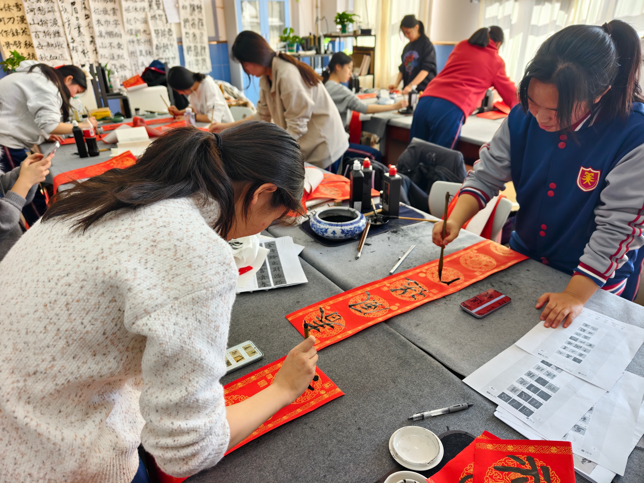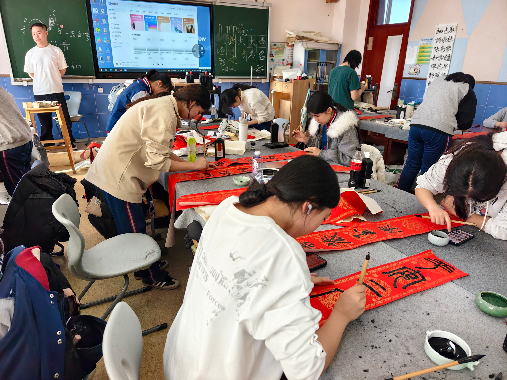 课桌上,鎏金红联纸、砚台与毛笔错落排开。庞中华老师边示范边讲授,学生们纷纷实践,随笔尖起落,“福启新岁”“智绘青春”等联语渐次成形,既有楹联工整之美,又含少年笔墨灵秀。