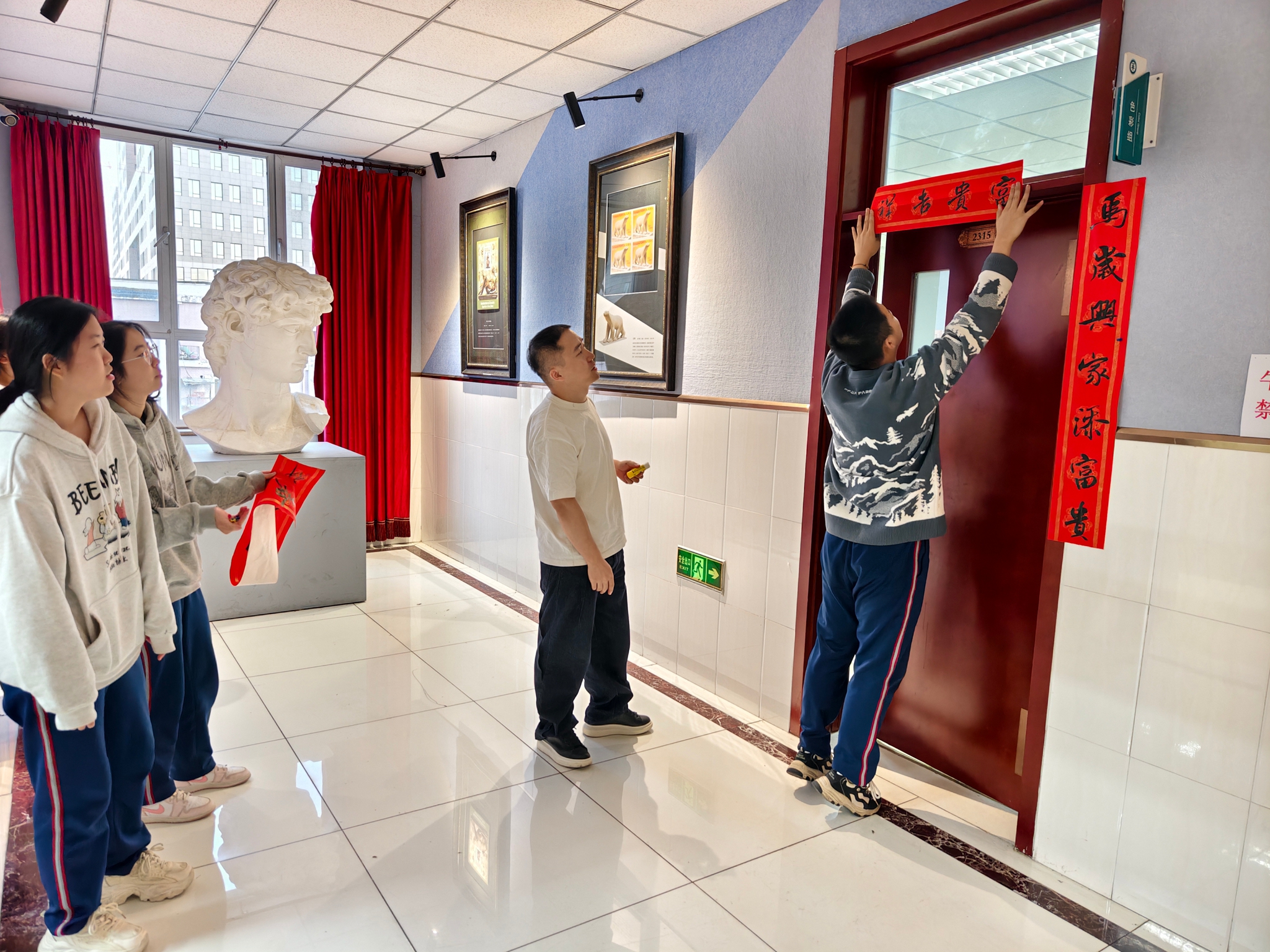 午后,师生捧对联穿梭走廊,将对联作品贴在教室门口。红联映着窗明几净,路过的老师纷纷驻足:“手写的对联才有年味儿,这是最生动的文化传承课。”