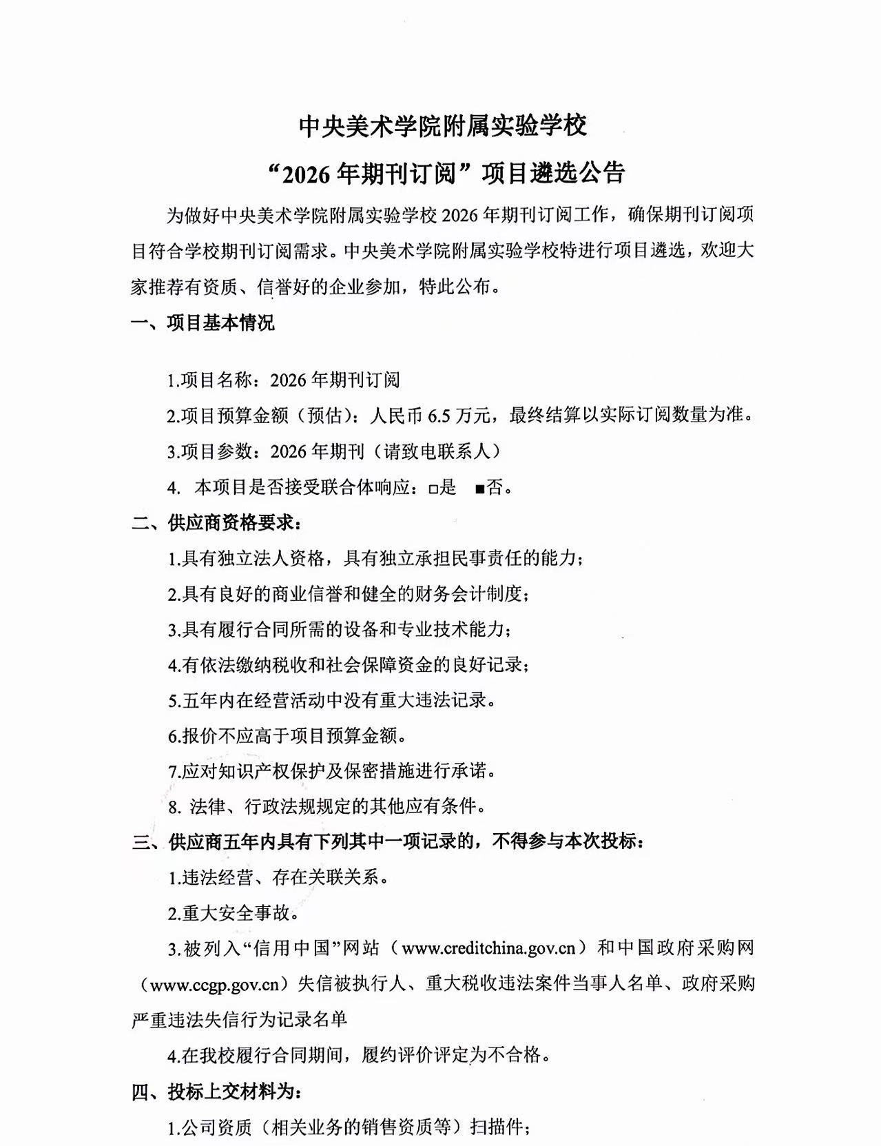 中央美术学院附属实验学校“2026年期刊订阅”项目遴选公告