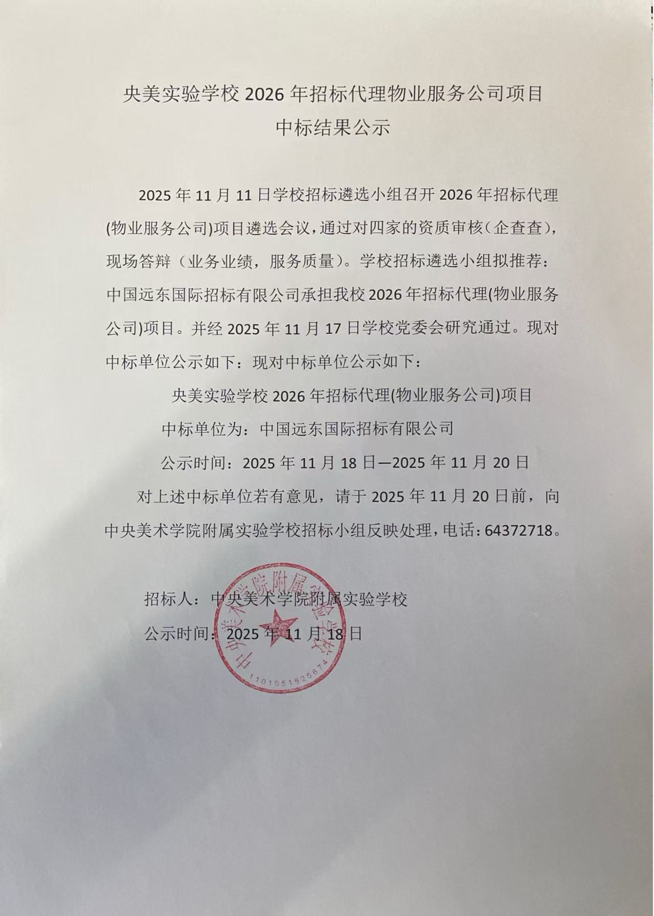 央美实验学校2026年招标代理物业服务公司项目中标结果公示