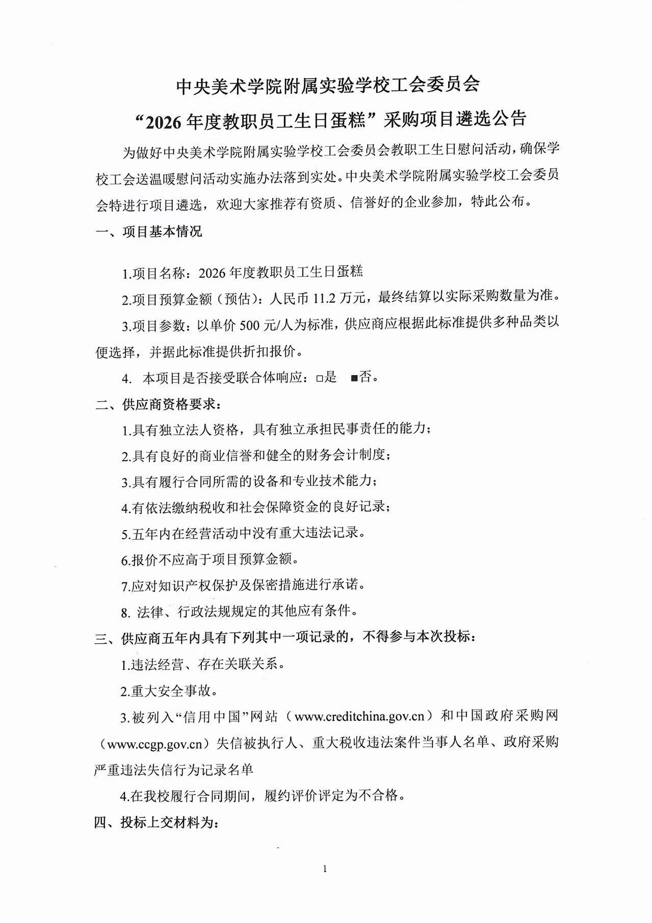中央美术学院附属实验学校工会委员会2026年度教职员工生日蛋糕采购项目遴选公告