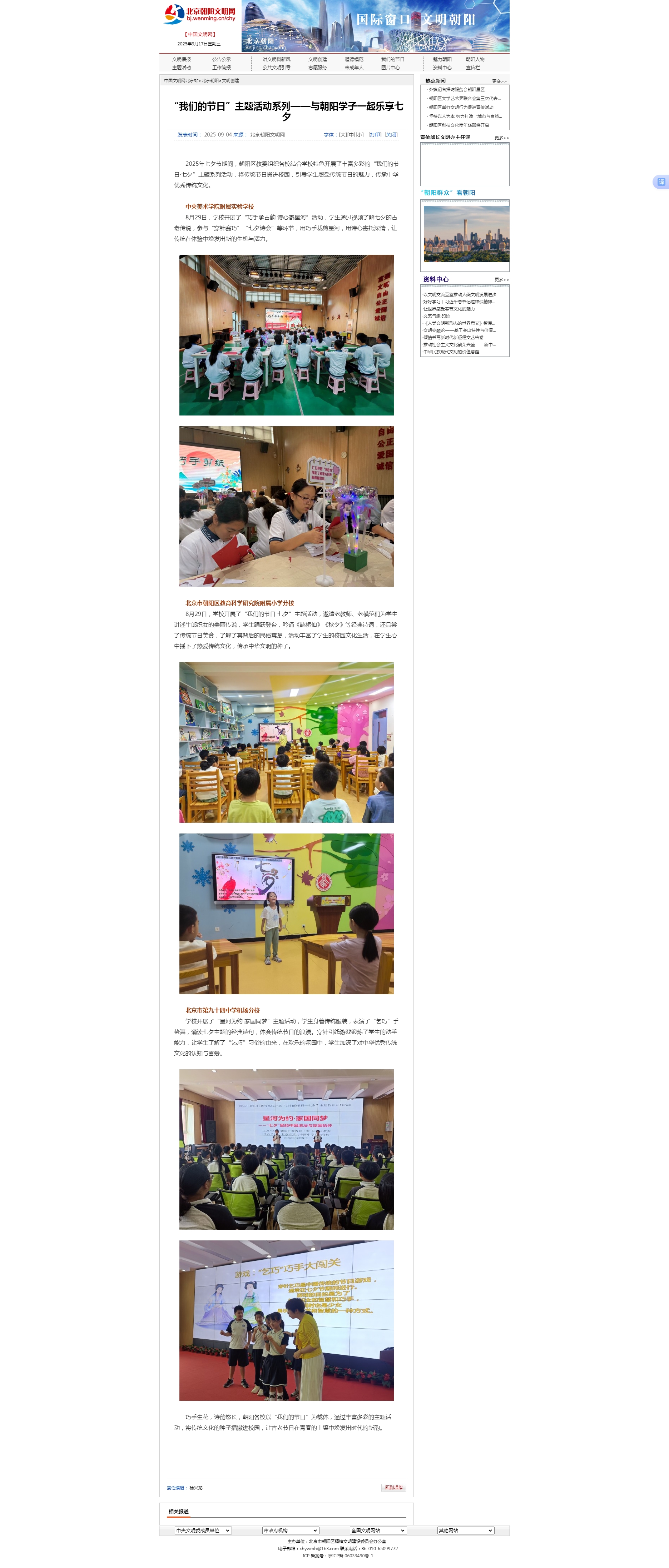 北京朝阳文明网刊载“我们的节日”主题活动系列——与朝阳学子一起乐享七夕,文中记述央美实验学校学生当日参与活动情况