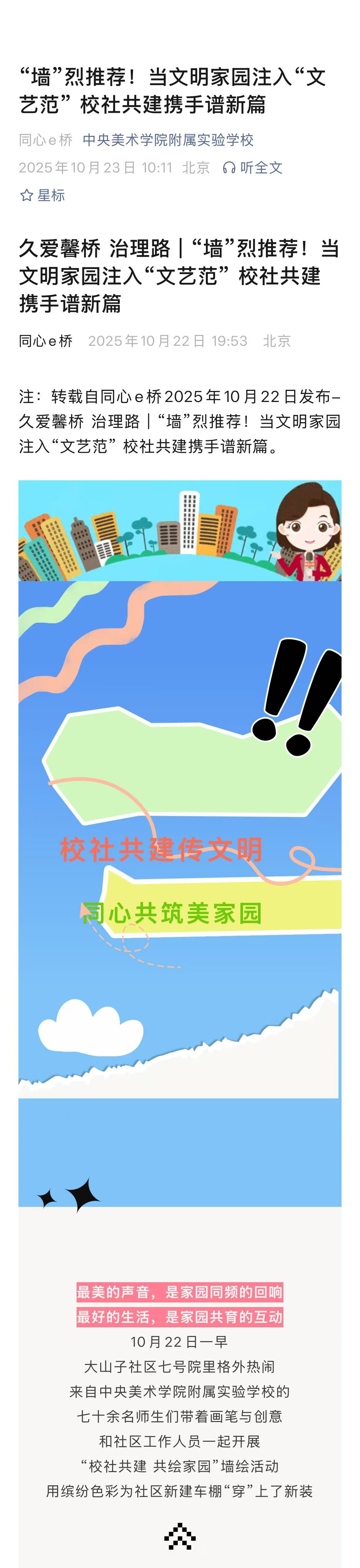 注:转载自同心e桥2025年10月22日发布-久爱馨桥 治理路 | “墙”烈推荐!当文明家园注入“文艺范” 校社共建携手谱新篇。