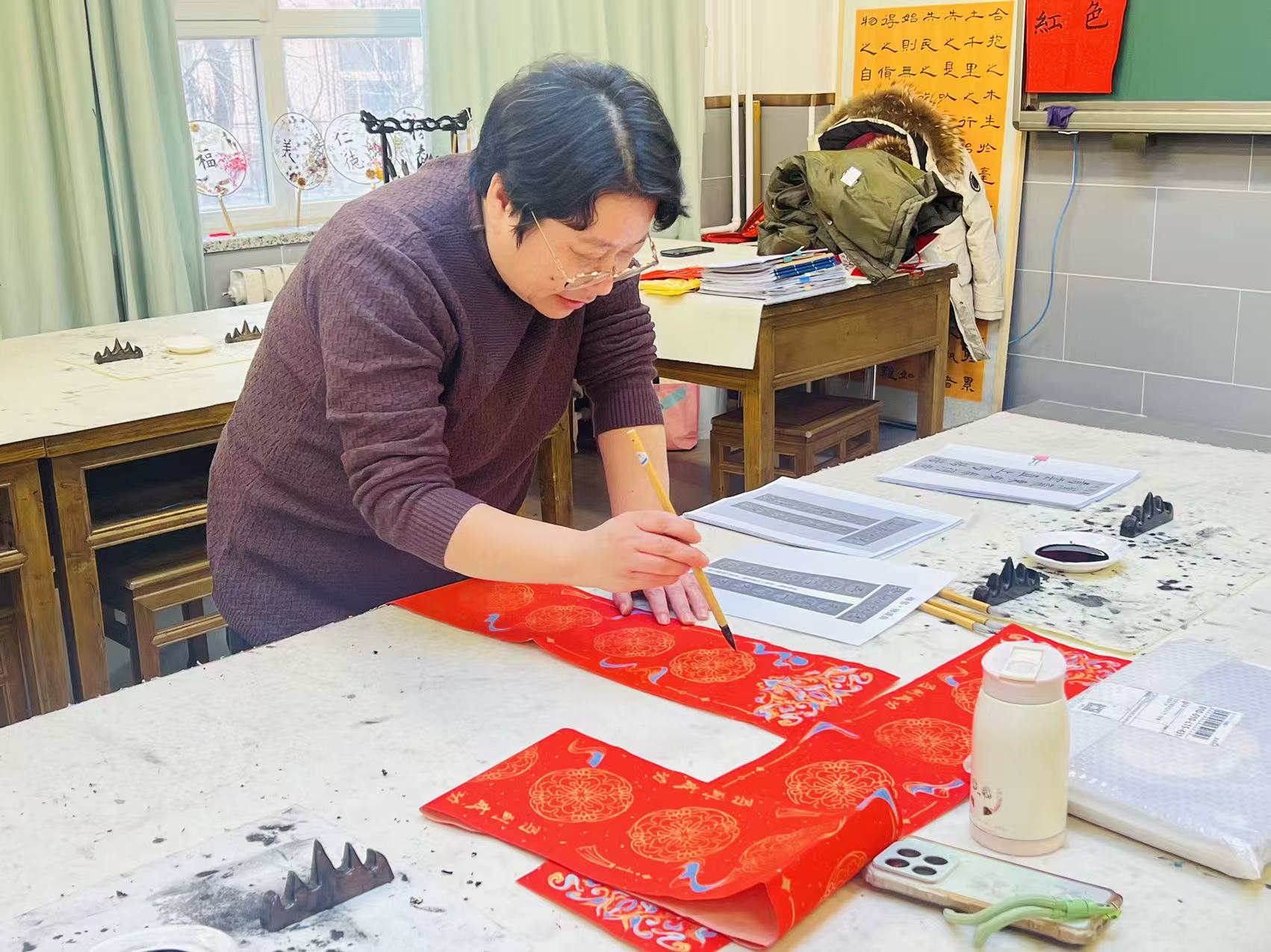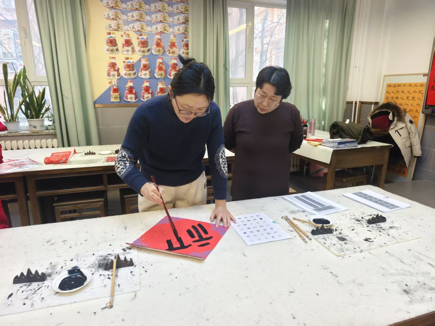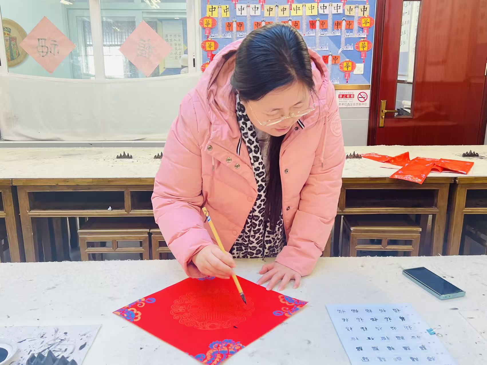 活动尾声,一场别开生面的“笔墨贺新春”软笔书法创作活动为本次沙龙画上圆满句号。班主任老师们挥毫泼墨,将对教育的赤诚、对新春的期许融入笔端。