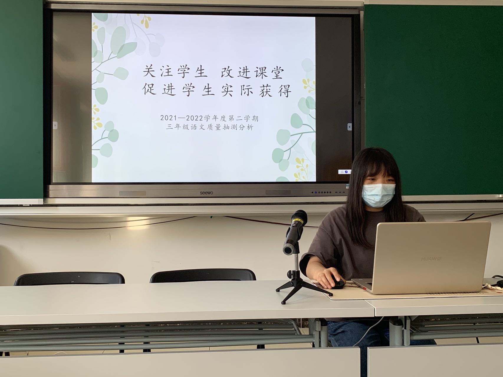 会上,语文、数学、英语三个学科教师分别进行学科教学质量分析。李娜、黄元尊2名教师分别以“关注学生 改进课堂 促进学生实际获得”和“由简入深”对三年级语文质量监测和六年级语文毕业考试进行了细致分析,指出语文识字、写字和阅读指导方面的训练方法,通过拓展课外阅读帮助学生积累素材,进而提高写作技巧,最终提升语文教学质量。毛春燕、王静2名教师分别对三年级数学质量监测和六年级数学毕业考试进行细致分析,提出围绕数学核心素养认真研读课标和教材,结合学生情况设计教学,注重培养学生“会用数学的眼光观察现实世界;会用的思维思考现实世界;会用数学的语言表达现实世界”。英语教师张颖针对六年级英语毕业考试进行质量分析,指出备课时教师要深挖育人价值观,创设模拟语境组织学生交流,同时根据学情开展英语绘本阅读活动,切实提高英语核心素养和教学质量。