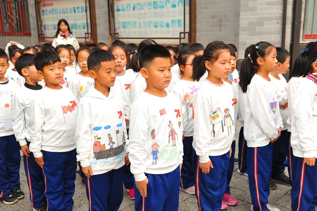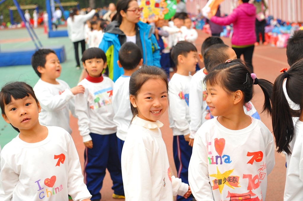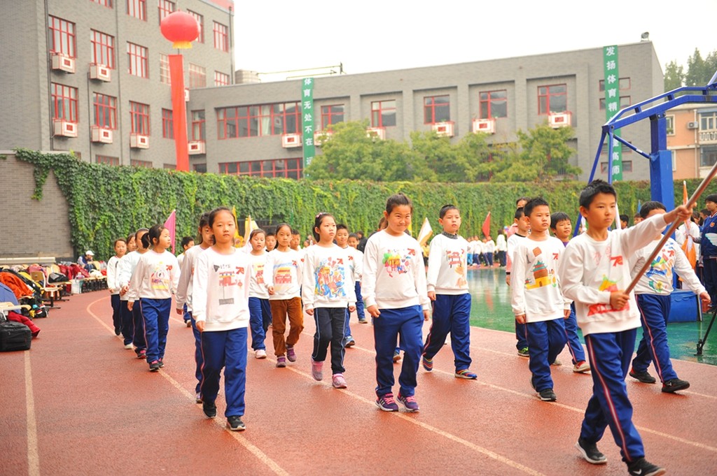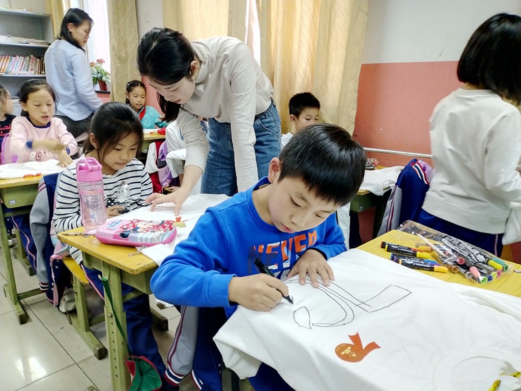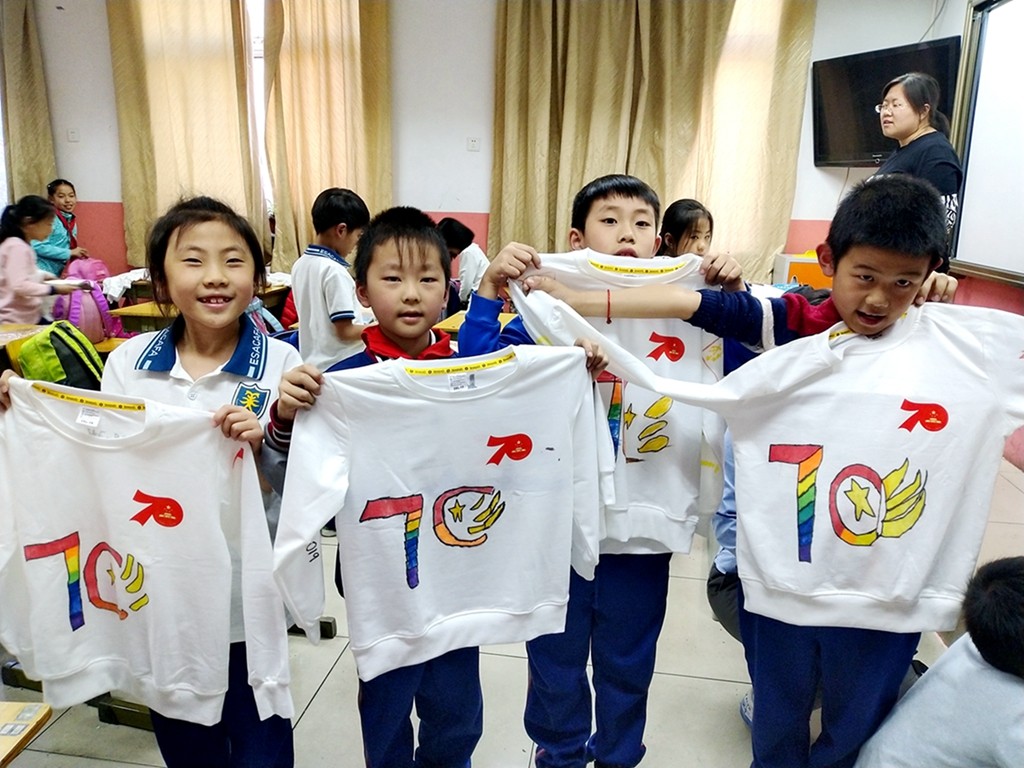 学生在老师的带领下,利用水彩笔绘制各种和国庆有关的卡通文化衫,自己构思、设计,将富有个性的美丽图案勾画在T恤衫上。他们在学校全运会上统一穿着自己设计的文化衫,迈着整齐的步伐,昂首挺胸的走过主席台,尽情展示各班特色。