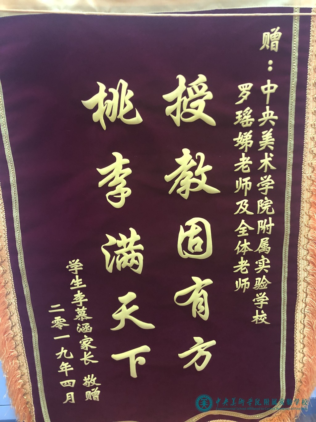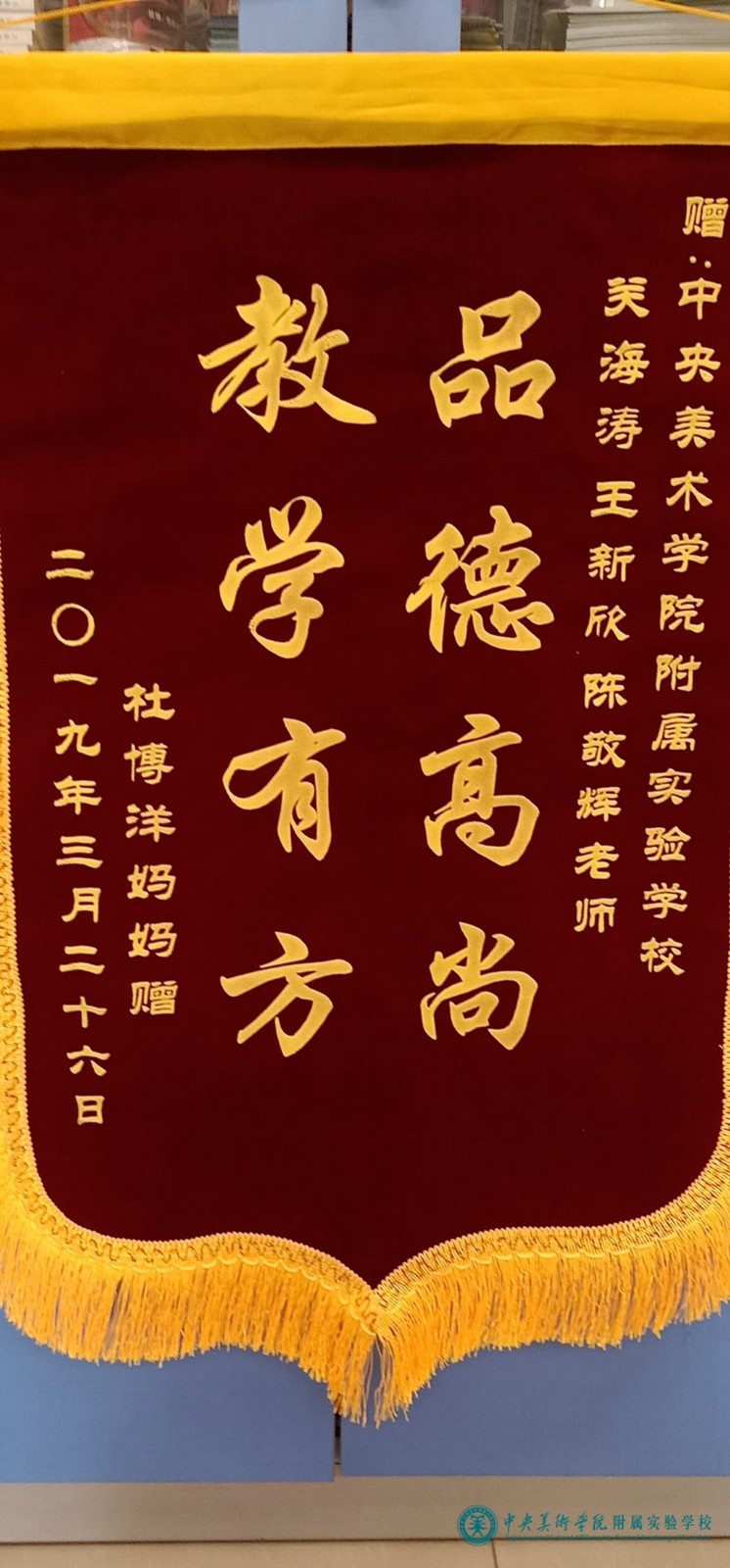 2019-04-09 10:04:53近日,学校分别收到来自小学一部三(1)班杜博洋,二部一(2)班李慕涵两位同学家长送来的锦旗和表扬信,感谢央美实验学校大家庭一个多学期来对杜博洋、李慕涵的关怀与帮助,特别感谢小学部关海涛、王新欣、陈敬辉、罗瑶娣四位老师一直以来对杜博洋、李慕涵在校学习生活的谆谆教诲、启迪培养。