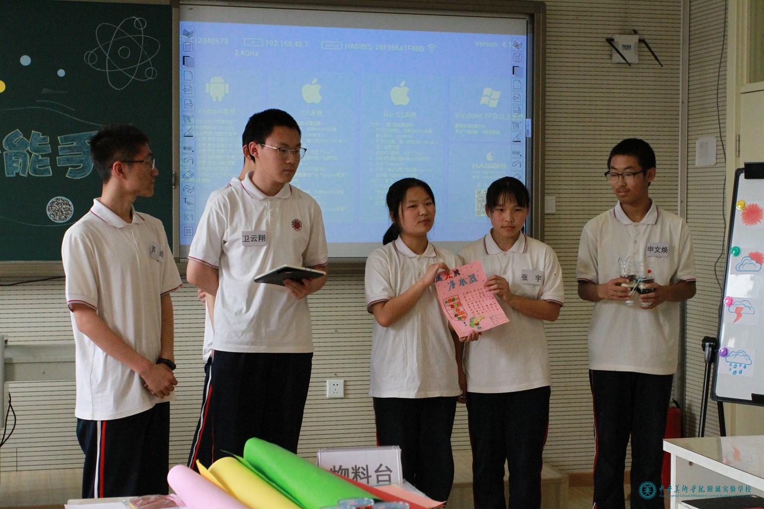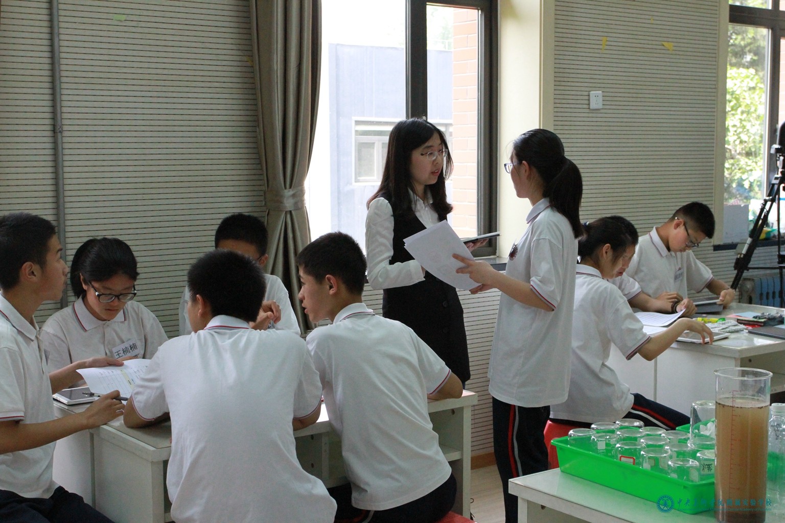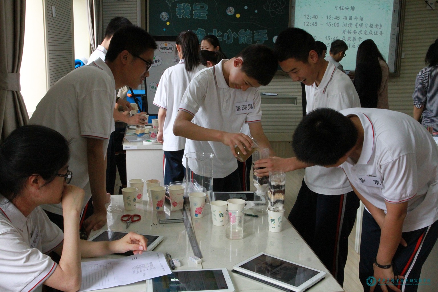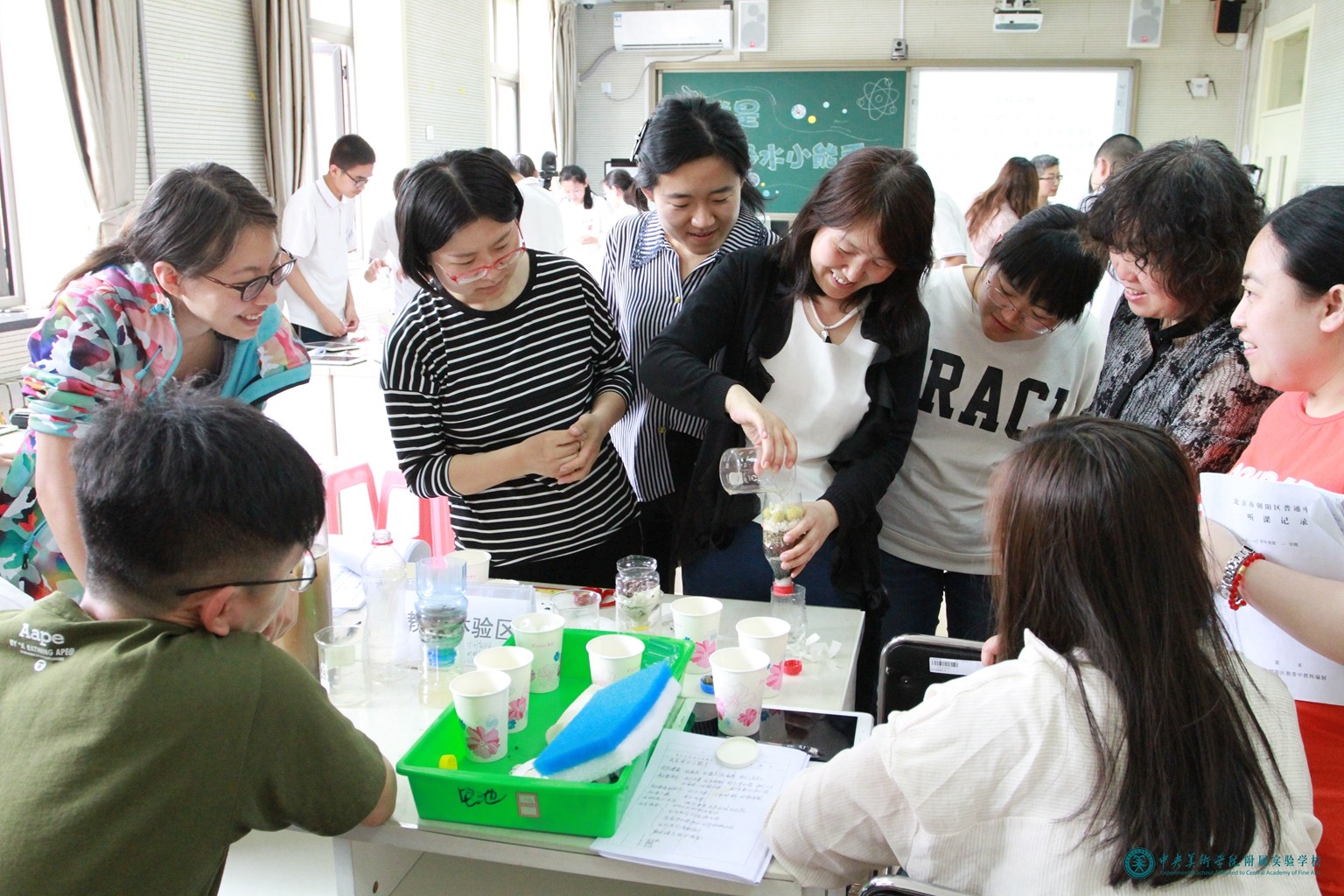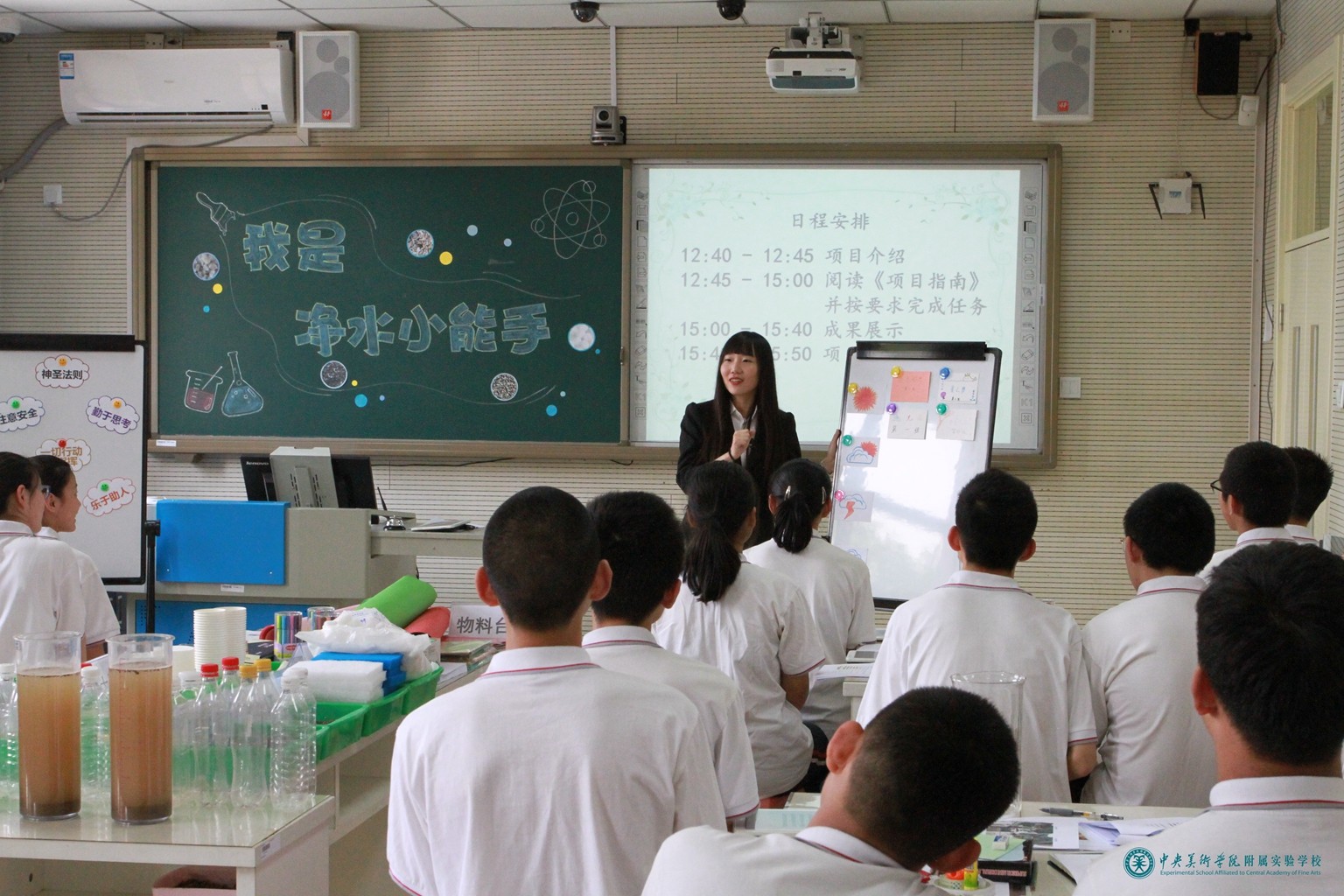 化学教师周娜担任了此次项目式融合课展示活动负责人,她与物理教师马丽娜、美术教师任芊颖共同开展了主题为《我是净水小能手—净水器设计大赛》项目式融合课,全校初三学生参加了此项活动。三位教师在课前认真备课、精心准备活动器材,修改项目指南,反复磨课。项目组专家及学校相关领导来到活动现场,三位教师在课上展示出了自己扎实的教学功底,使学生在生动、活跃、丰富的氛围中获取了知识,提升了自己各方面的能力。课后,项目组专家张洁博士进行了精彩点评,评课具有很强的针对性和专业性,分别从教师观念的转变、教师教学行为的转变、学生参与效果以及取得的教学成果进行了细致的点评。