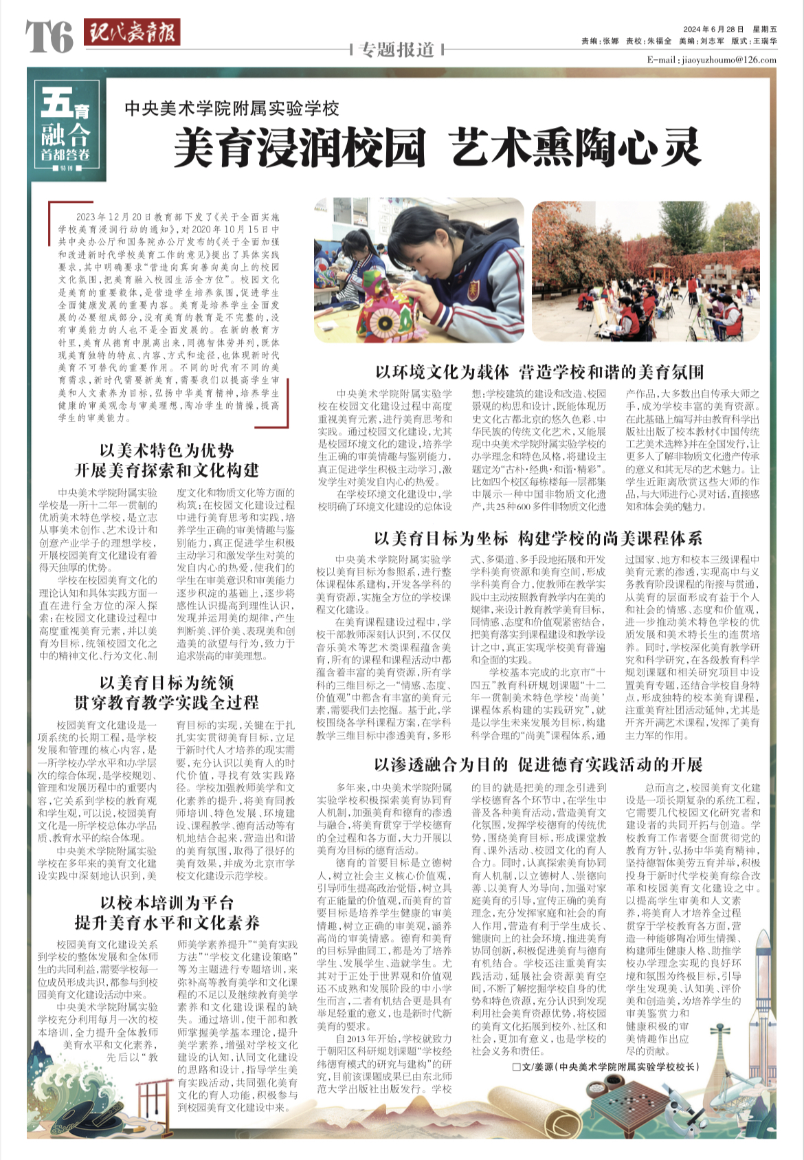 20240628-T6《现代教育报》专题报道刊载中央美术学院附属实验学校校长姜源撰写文章“美育浸润校园 艺术熏陶心灵”。