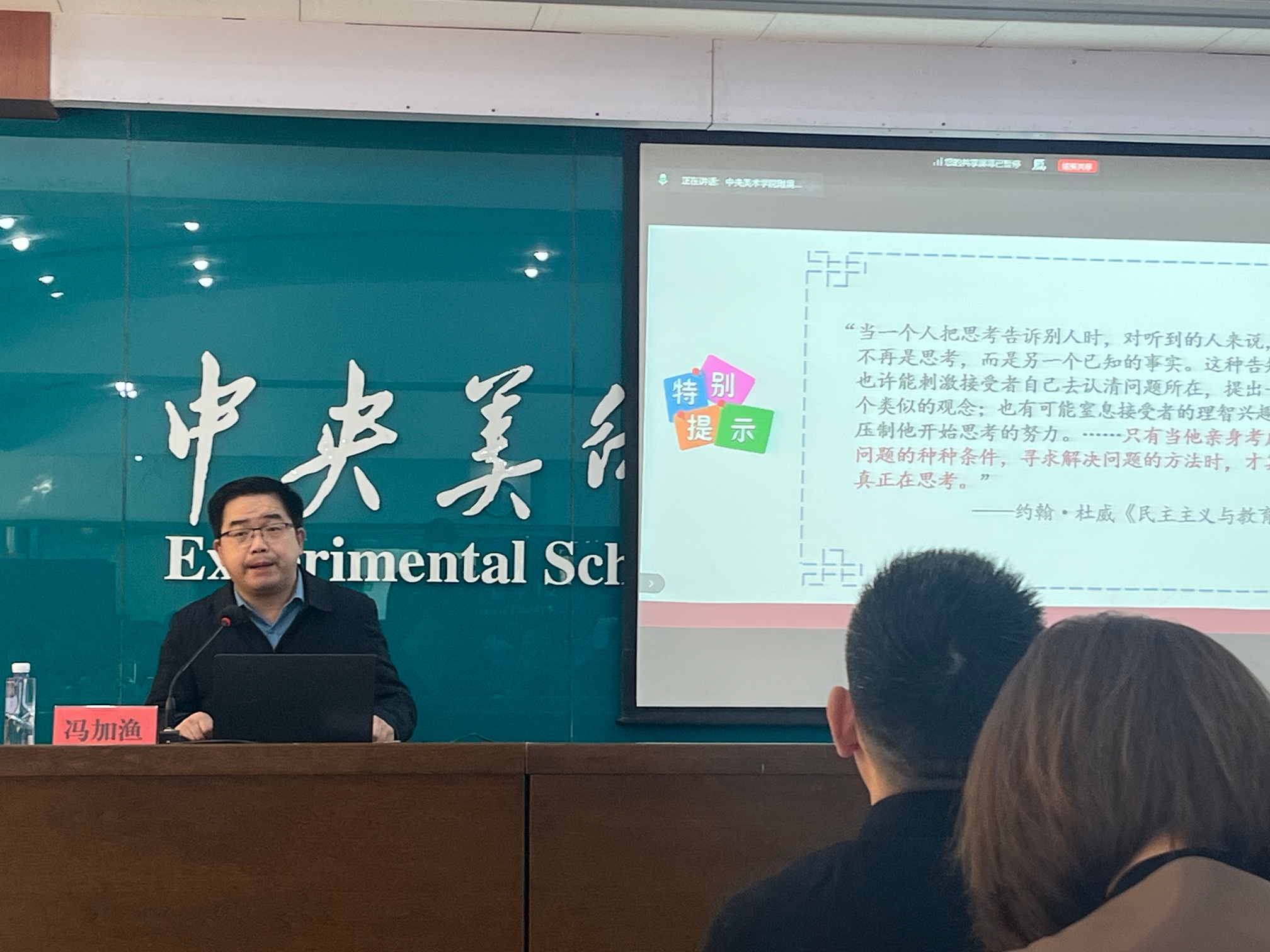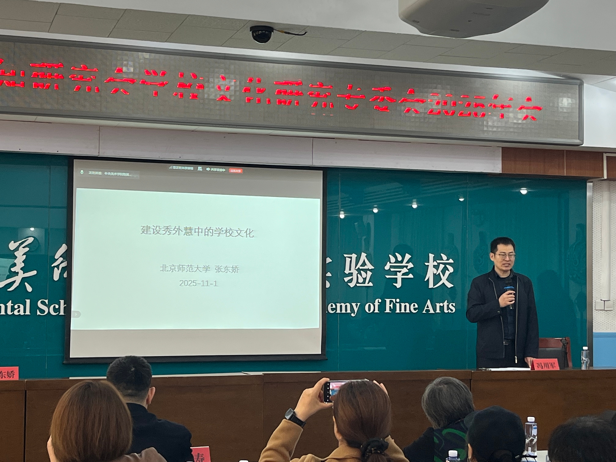 专家报告环节,北京师范大学张东娇教授以“建设秀外慧中的学校文化”为题,提出学校文化应具备“慧于中、诚于内、秀于外”的特点,并分享13种实操方法,为学校文化建设提供了方法论指引;陕西师范大学冯加渔博士聚焦“数智时代的学校文化建设”,剖析了当前学校文化建设的新挑战,提出了营造智慧环境、推动组织变革、重塑文化愿景的三维文化建设新路径;姜源校长结合学校办学特色,分享了“新时代背景下学校文化建设的思考与实践”,从理论构建、具体实践到未来文化建设的思考,展现了央美实验学校将中华优秀传统文化、美术特色与技术融合的学校文化建设探索历程。